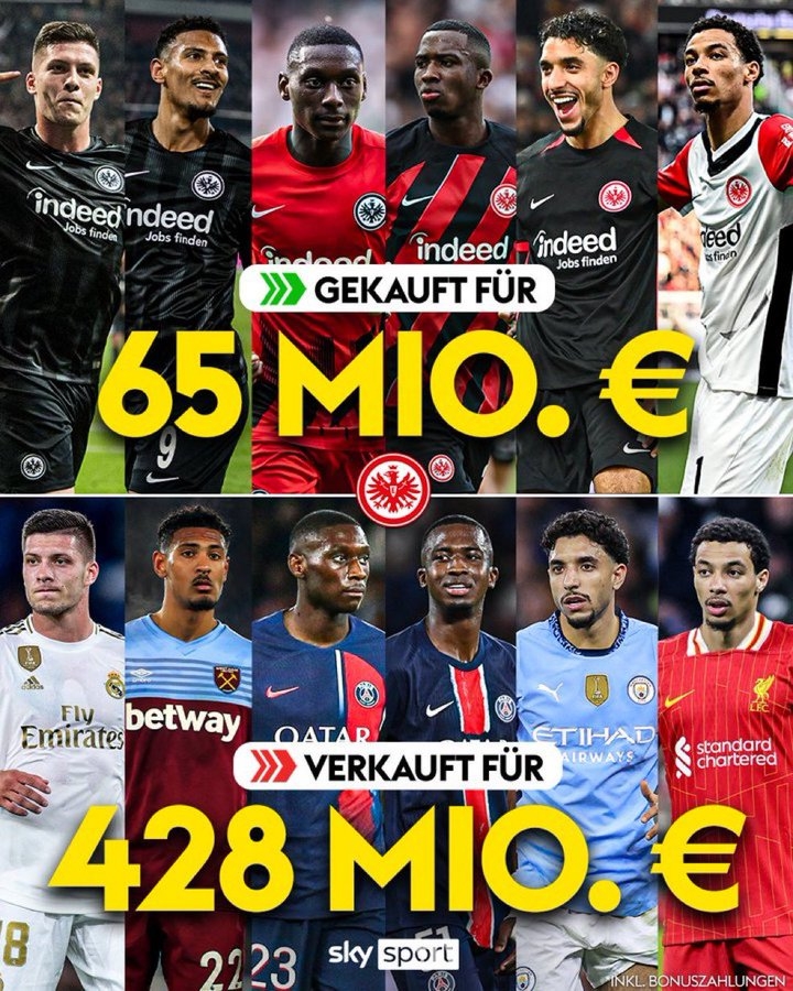 法兰克福向来有“德甲黑店”的传统,约维奇、阿莱、穆阿尼、帕乔、马尔穆什、埃基蒂克等东说念主皆被他们以较低的价钱买入,之后高价卖出。