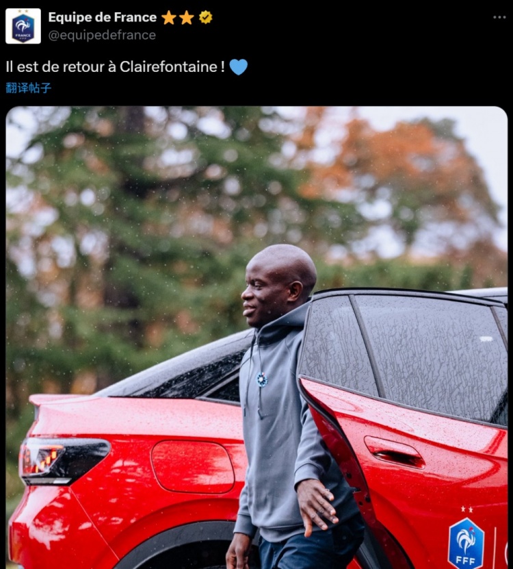 法国队官推也在不久前通过社媒晒出坎特搭车抵达闇练基地的像片,并爽快得暗意:“他回到了克莱枫丹!”