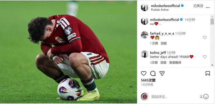 凯尔凯兹此役为匈牙利踢满全场,但未能匡助球队取得附加赛阅历,赛后他在酬酢媒体上晒出我方蹲在球场内失意的相片。
