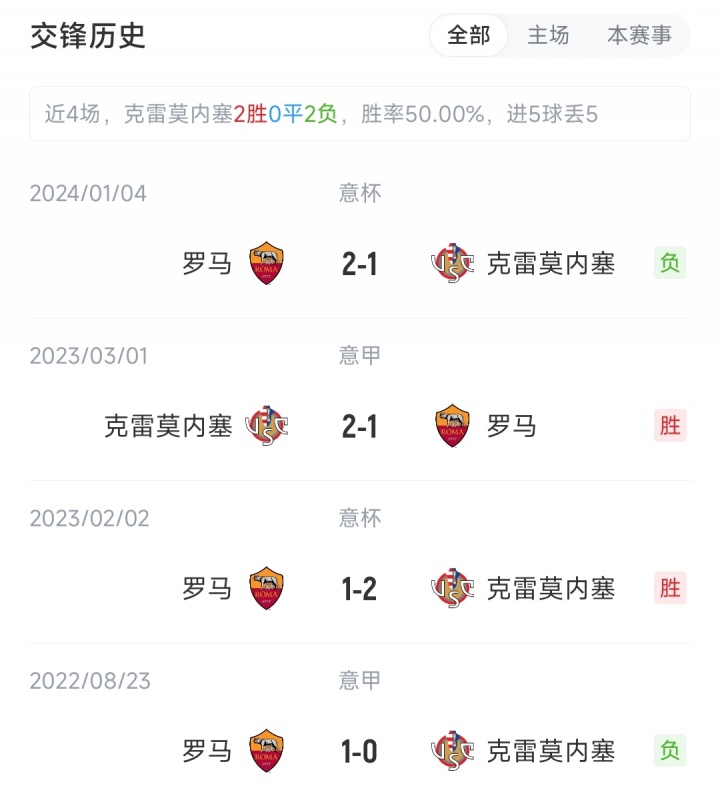 终结赛前,罗马8胜3负积24分,排行意甲积分榜第3;克雷莫内塞3胜5平3负积14分,排行意甲积分榜第11。