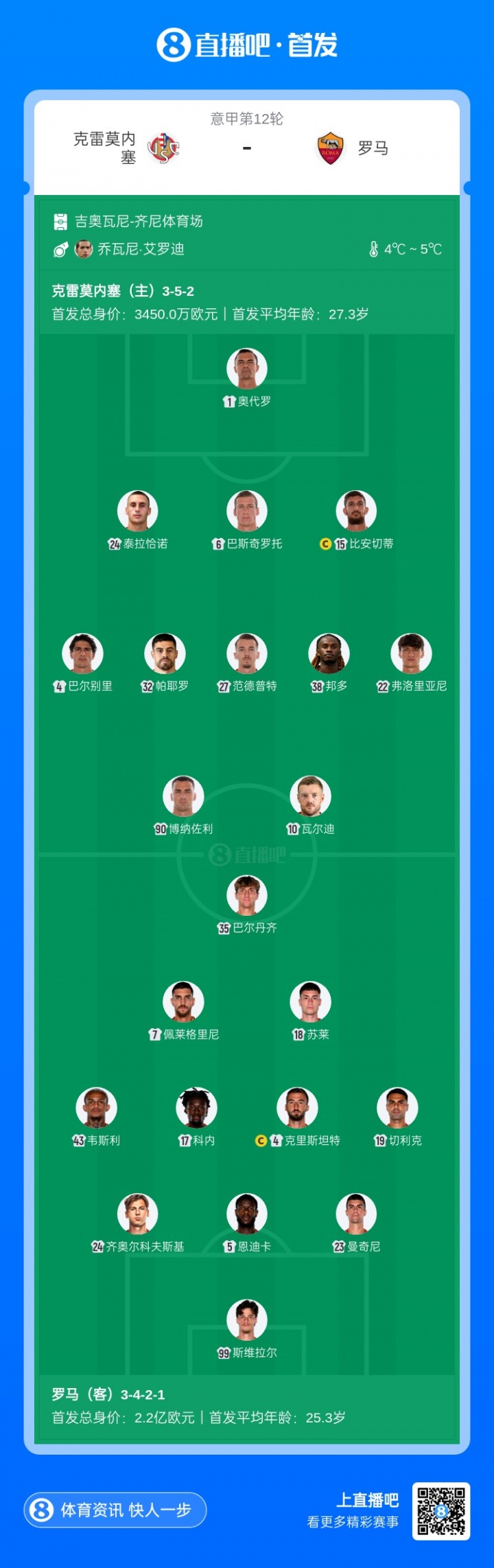 11月23日讯 北京技能今晚22点,意甲第12轮,罗马客场对阵克雷莫内塞,赛前两边公布首发威望。