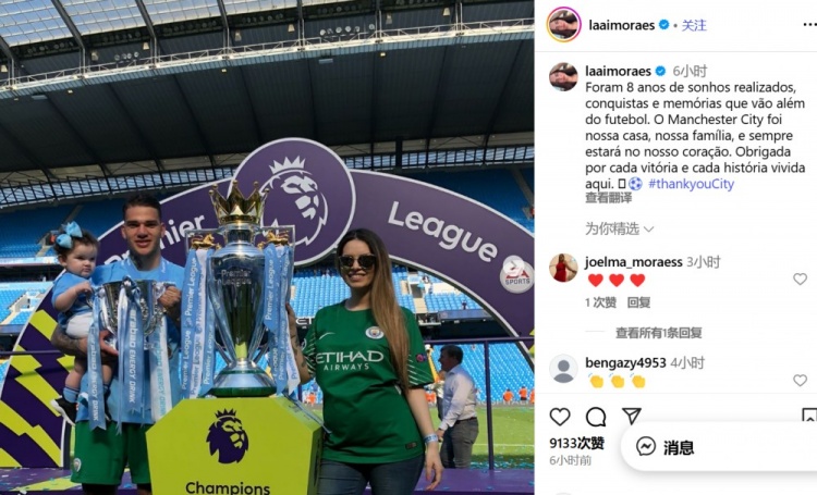 9月3日讯 在埃德森加盟费内巴切后,他的太太也发晓示别了曼城。