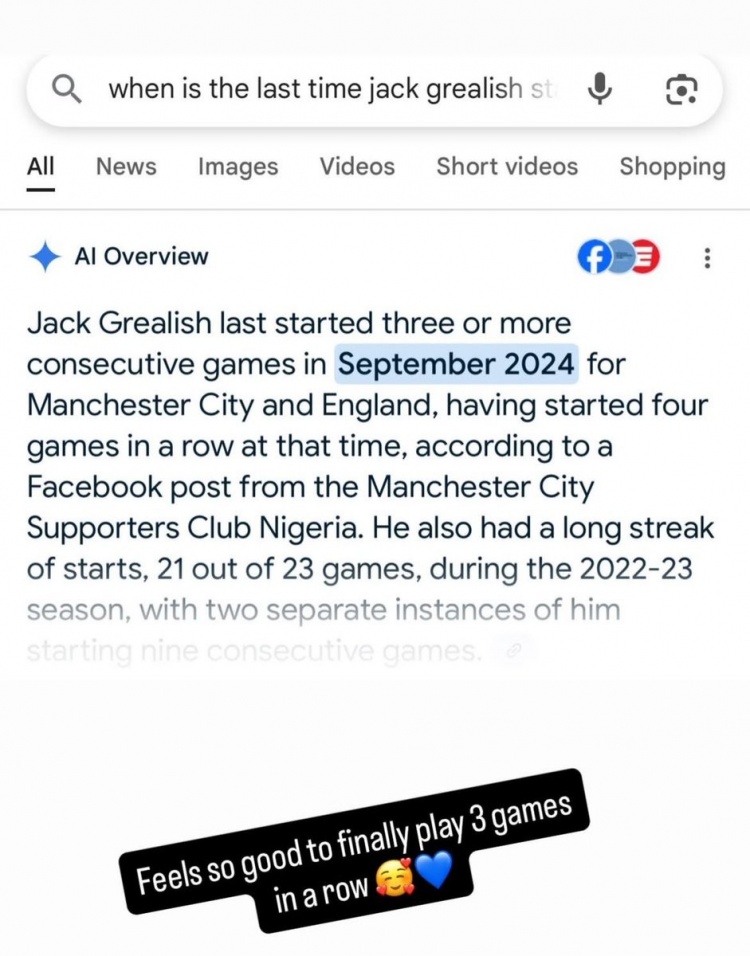 格拉利什通过社媒晒出了我方搜索我方前次销亡3场首发的信息,披露他前次销亡3场首发回是2024年9月。他对此点评谈:“终于又能销亡3场首发的嗅觉真棒!”