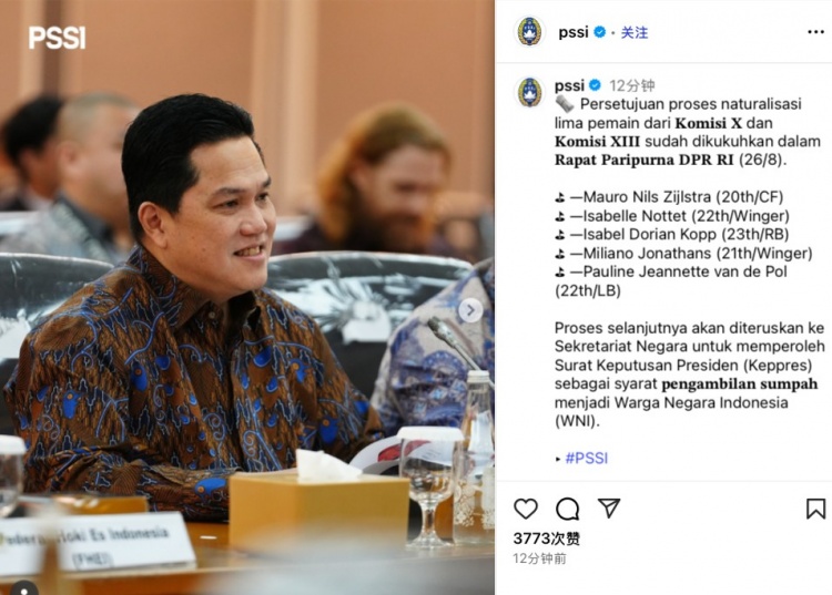 8月26日讯 印尼足协本日官方通告,在近日召开的印尼众议员会议上,5名球员的归化日程已得到会议通过。
