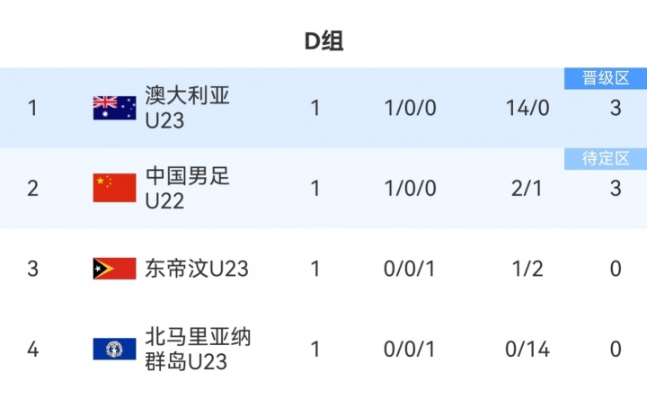 净胜球大幅过时!D组积分榜:澳大利亚14个净胜球第1,U22国足第2