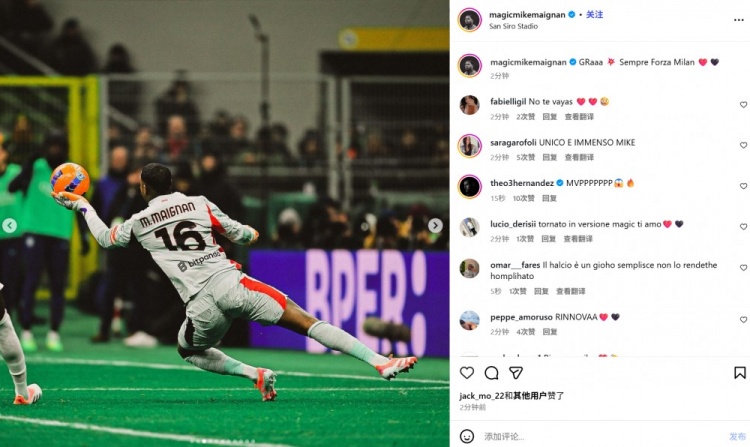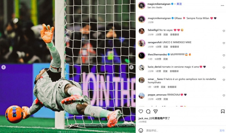他也在赛后通过社媒晒出我方的多张扑救照,并配文:“哈!💥 恒久佛砸米兰(米兰前进)❤️🖤”