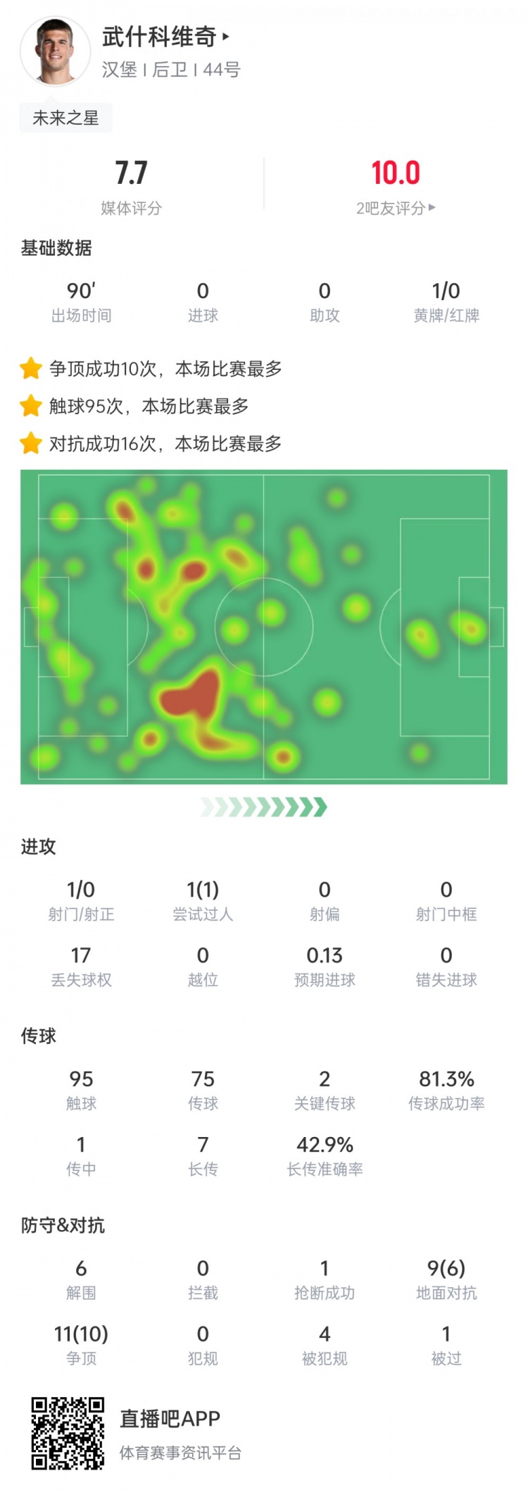 此役武什科维奇争顶奏效10次,全场最多。据Sofascore统计,本赛季武什科维奇在2场联赛中争顶奏效10+况且奏效用提高90%,而五大联赛其他2021名球员加起来也只作念到2次。