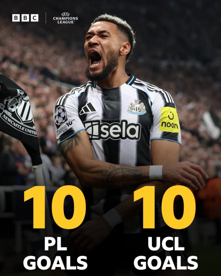 据BBC统计,纽卡本赛季欧冠4场比赛打进10球,进球数目与本赛季10场英超比赛调换。