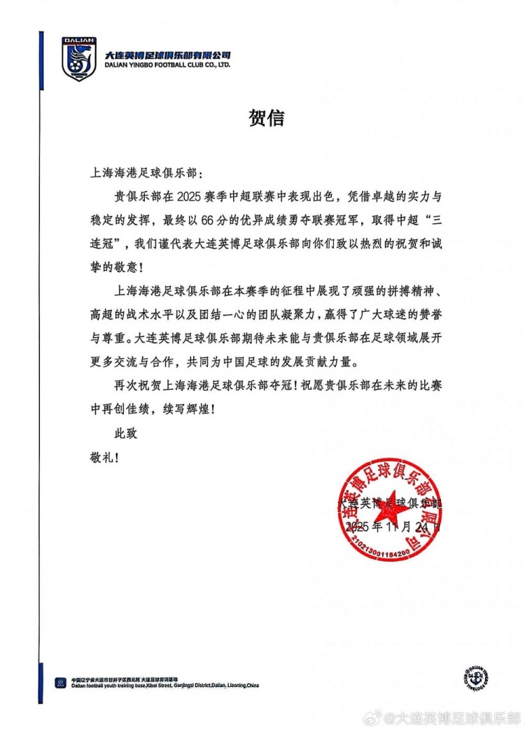 本日大连英博官方发布贺信,祝福上海海港夺冠,贺信写说念: