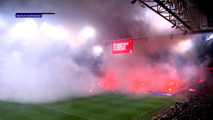 阿贾克斯与格罗宁根的比赛在今晚仅进行了五分钟。由于死忠球迷看台(球门后方)燃放了多半烟花,球员们其时不得不奔走着离开球场。