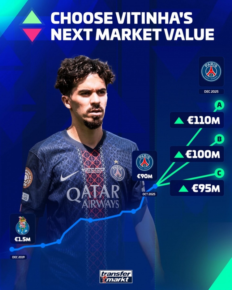 德转预热维蒂尼亚最新身价(现在9000万欧元):