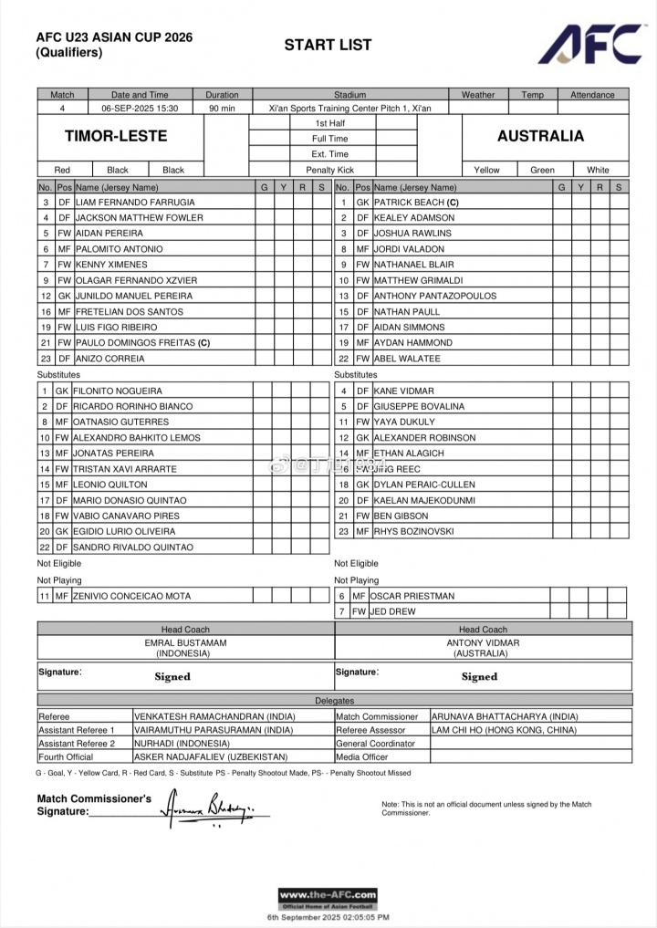 09月06日讯 U23亚初赛第2轮,东帝汶vs澳大利亚,两边首发出炉。与第一场14-0大捷北马里亚纳群岛的首发威望比较,澳大利亚进行了7东谈主大交替。