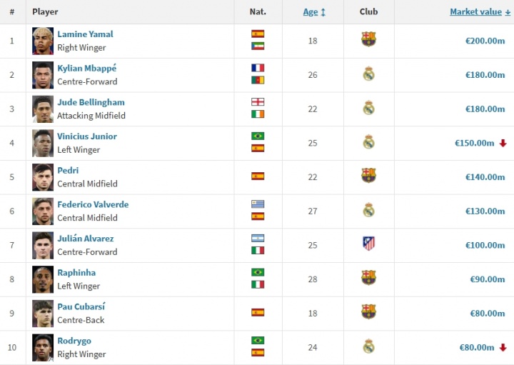 10月02日讯 德转今天发布了最新一期西甲身价更新,西甲前十身价也迎来些微的变化,最新西甲身价前十如下: