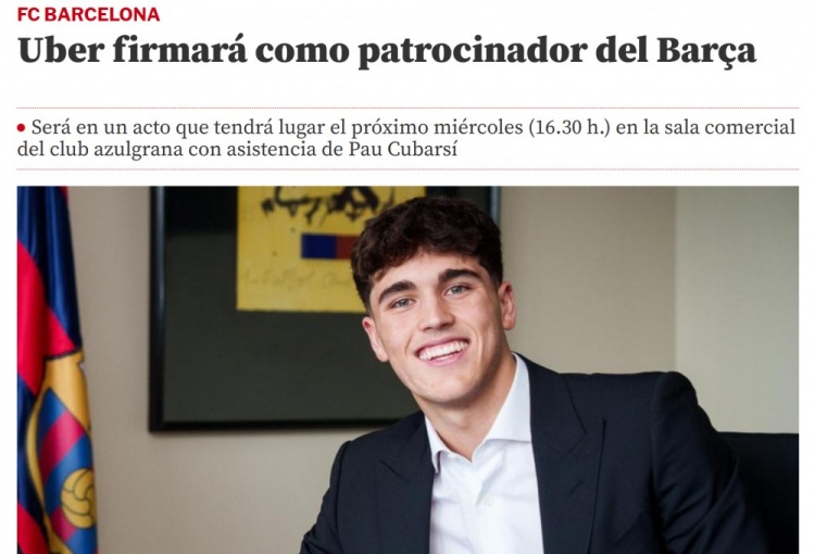 10月18日讯 西媒《寰宇体育报》报谈,巴萨俱乐部将与Uber公司签署一项支持合同,动作将于当地技能下周三16:30在巴萨俱乐部的贸易厅举行。