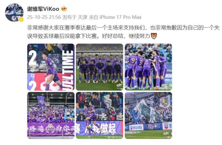 10月25日讯 中超联赛第28轮,天津津门虎主场2-2绝平长春亚泰。赛后,为津门虎完成绝平的谢维军更新了个东说念主酬酢媒体。