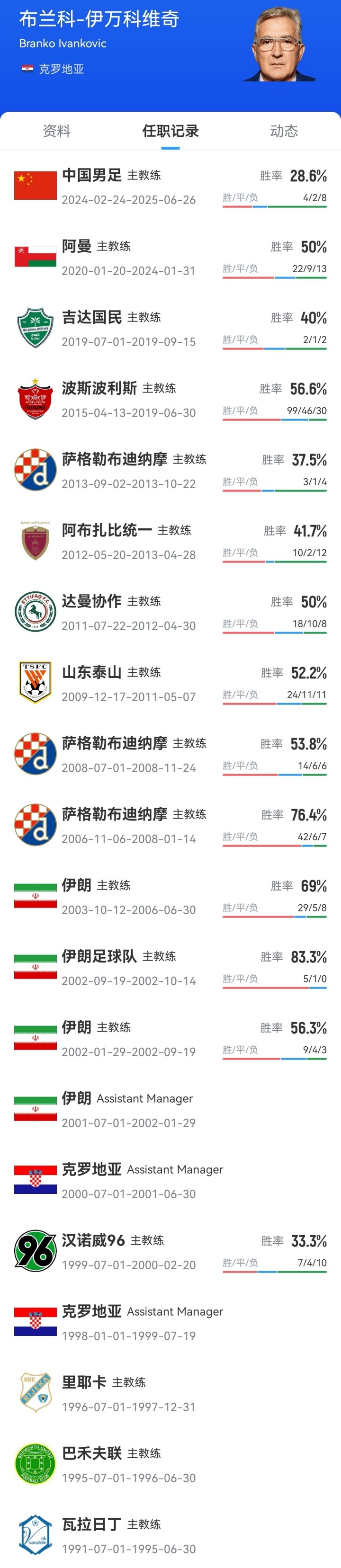 2024年2月24日,伊万出任中国男足主帅,2025年6月27日下课,本领共带队崇拜比赛14场,战绩为4胜2平8负。其中叶初赛36强赛国足1胜2平1负“躺进”18强赛,18强赛国足3胜7负进7球丢20球,提前1轮无缘2026好意思加墨天下杯。国足也成为伊万握教生计的终末一站。