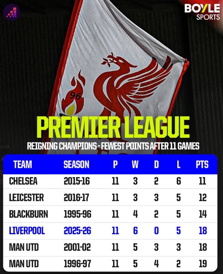 11月10日讯 在本轮英超,利物浦0-3不敌曼城,11轮事后只取得18分,OPTA也清点了英超历史卫冕冠军在前11轮事后最少积分情况,本赛季利物浦排在第四,具体如下:
