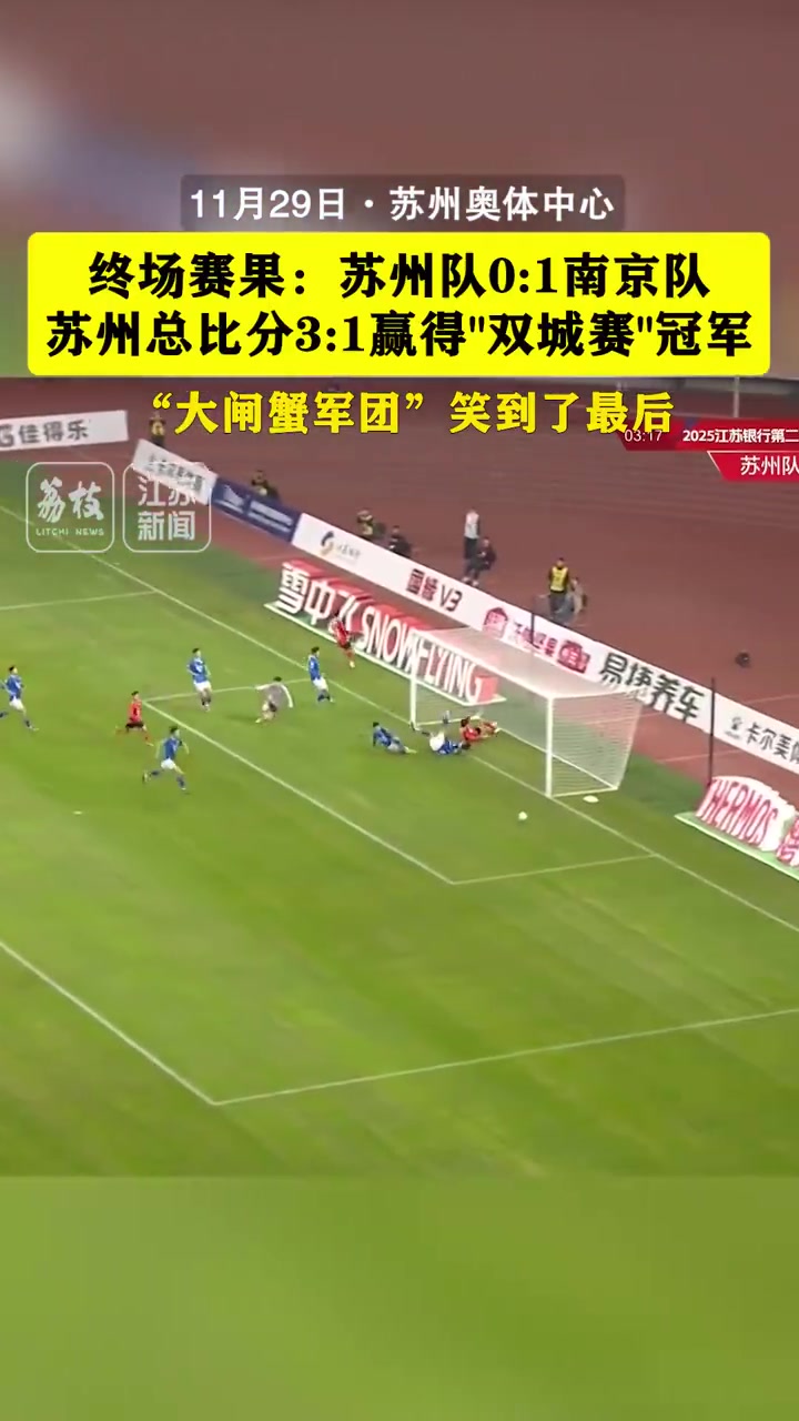 11月30日讯 苏州队在第二届江苏省足球发展重心城市抗争赛(双城赛)中,首回合客场3:0胜南京队,次回合主场虽0:1小负南京,仍以两回合总比分3:1奏效卫冕。