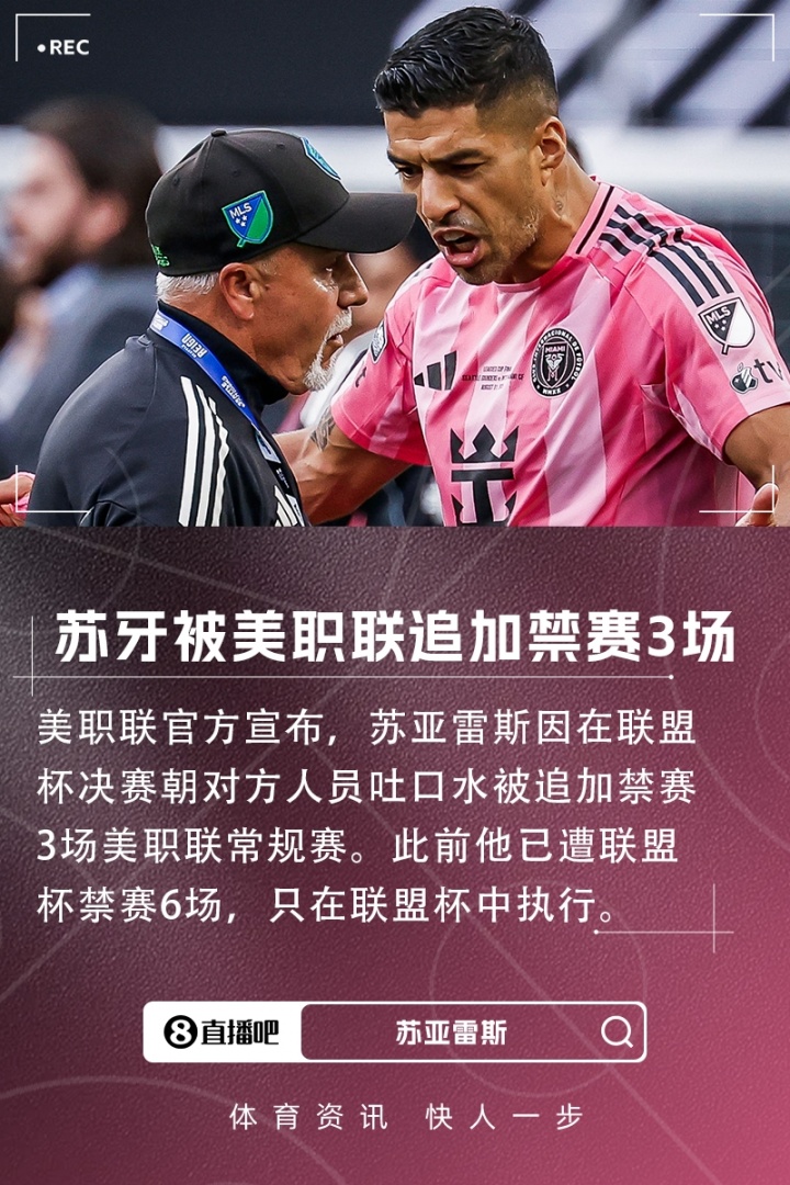 苏亚雷斯被停赛三场MLS旧例赛,将缺席9月14日(客战夏洛特FC)、9月17日(主场对阵西雅图海湾东说念主)以及9月21日(主场迎战华盛顿联队)的比赛;