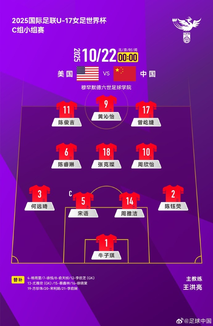 10月21日讯 2025海外足联U-17女足寰宇杯C组小组赛第2轮,好意思国队VS 中国队首发名单出炉!