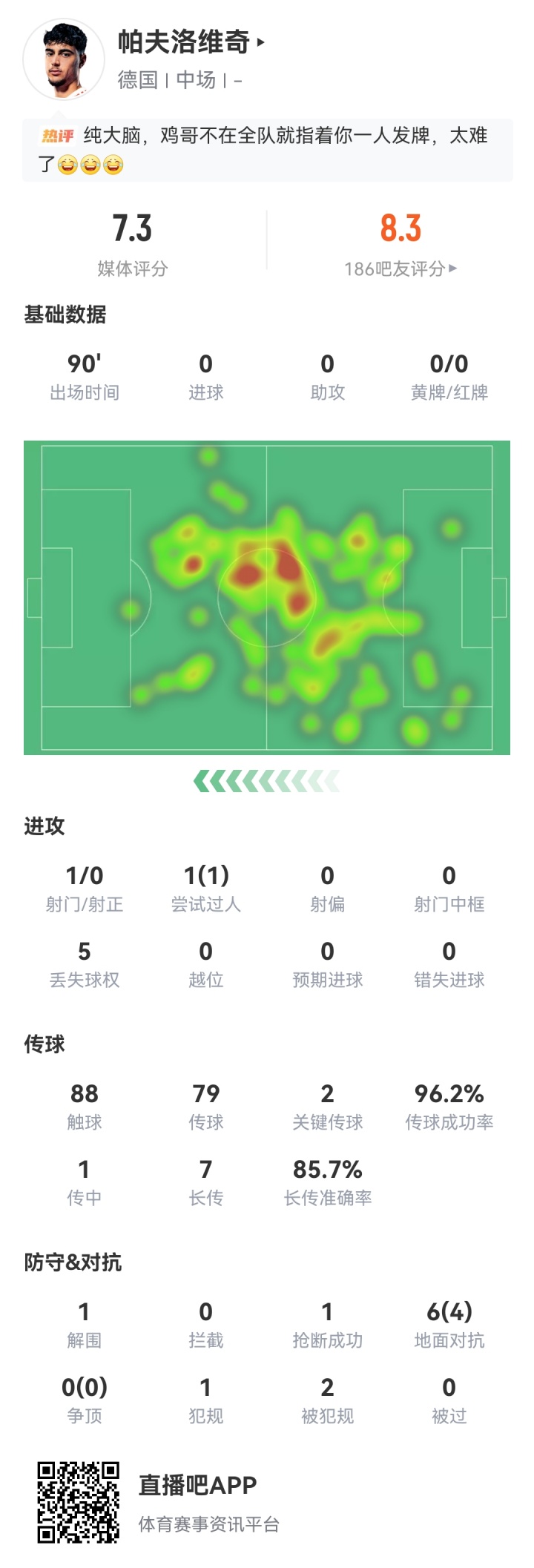 帕夫洛维奇依然联贯3轮世初赛占据了德国队后腰的首发位置,可以见得主帅纳格尔斯曼对他的信任。本场比赛帕夫洛维奇发达可以,79次传球告捷率96.2%,长传告捷率85.7%,6次抗争4次告捷。