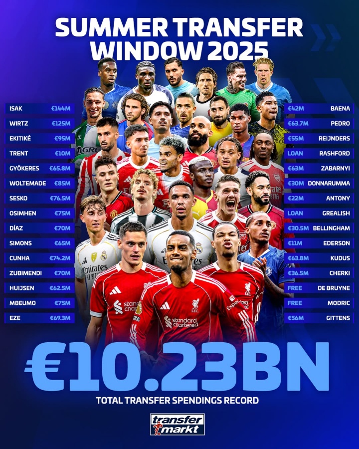 德转发布海报,该机构统计示意,足坛今夏转会窗的总开销达到惊东谈主的102.3亿欧。