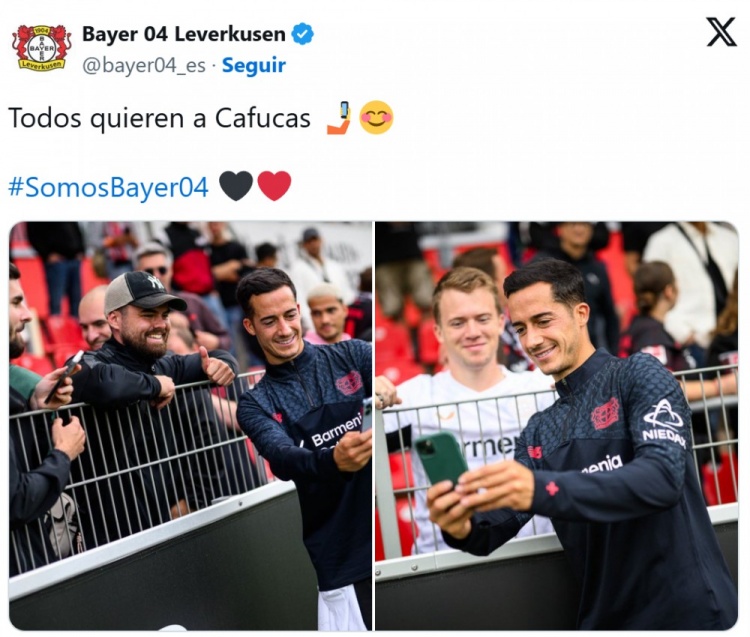 勒沃库森的西语官推也在赛后晒出了巴斯克斯和球迷们的自拍合影并默示:“民众齐心爱‘卡福克斯’。”