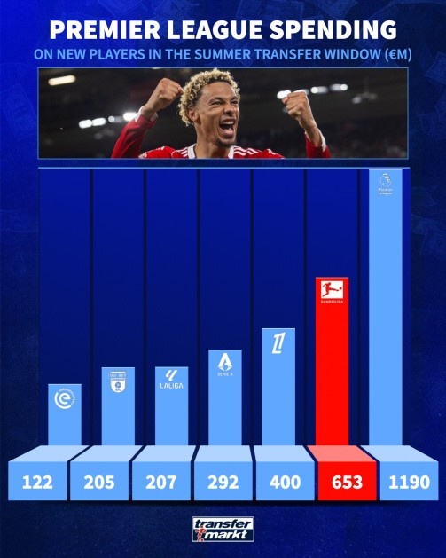 9月7日讯 《转会阛阓》统计了英超球队今夏引援所浪费转会费的行止,英超里面消化11.9亿欧元,而他们从德甲引援的转会费开销高达6.53亿欧元。